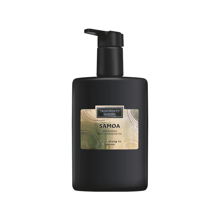 Verwen je huid met de tropische luxe van de Samoa Body & Massage Oil van Treatments. Deze zijdezachte olie combineert amandelolie en abrikozenpitolie voor een intens voedende en verzachtende werking. De lichte textuur trekt snel in en laat je huid langdurig gehydrateerd en stralend achter, zonder vet aan te voelen. De exotische geur van zoete mango, frisse limoen en een vleugje musk omhult je zintuigen en voert je mee naar het paradijselijke Polynesië. Ideaal voor een ontspannende massage of als dagelijkse verzorging. Vegan, dierproefvrij en vrij van parabenen.