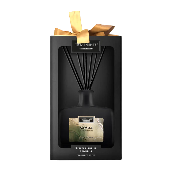 Breng een tropische sfeer in huis met de Samoa Fragrance Sticks van Treatments. De elegante zwarte glazen vaas met stijlvolle geurstokjes verspreidt subtiel en langdurig een exotische geur van zoete mango, frisse limoen en een vleugje musk. Deze geurcombinatie roept het paradijselijke Polynesië op en zorgt voor een warme, uitnodigende ambiance in elke ruimte. Dankzij de slimme formule is omdraaien van de stokjes niet nodig, maar kan naar wens voor extra geurintensiteit. Vegan, dierproefvrij en vrij van parabenen, een stijlvolle en bewuste keuze voor geurbeleving in huis.
